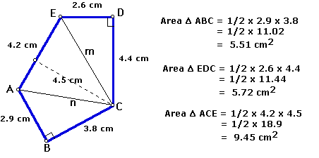 Now the areas of the three triangles are added to obtain the total area of the pentagon.