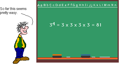 An exponent simply tells us how many times we are going to multiply a number or variable by itself. For instance, when we see 34, the 4 stuck up there in the air like that tells us to multiply 3 by itself 4 times.