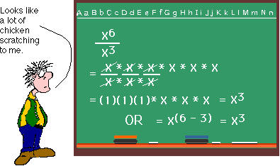 Subtracting exponents when we divide them is also just a short cut. Notice how the X's are stacked up in the problem below. We can arrange them so that we match X's in the numerator with X's in the denominator. Since any number (or variable) divided by itself equals 1, the matched X's can be eliminated. (Some people call this canceling.) The X's that are left over can be multiplied together (that is if we ever find out what X is worth.)