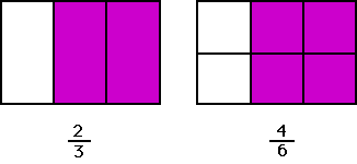 Look at the rectangles. One has 2/3 of its area is shaded. The other has 4/6 of its area is shaded. Even though 4 and 6 are bigger numbers than 2 and 3, the two fractions represent the same area. We call them equivalent fractions.